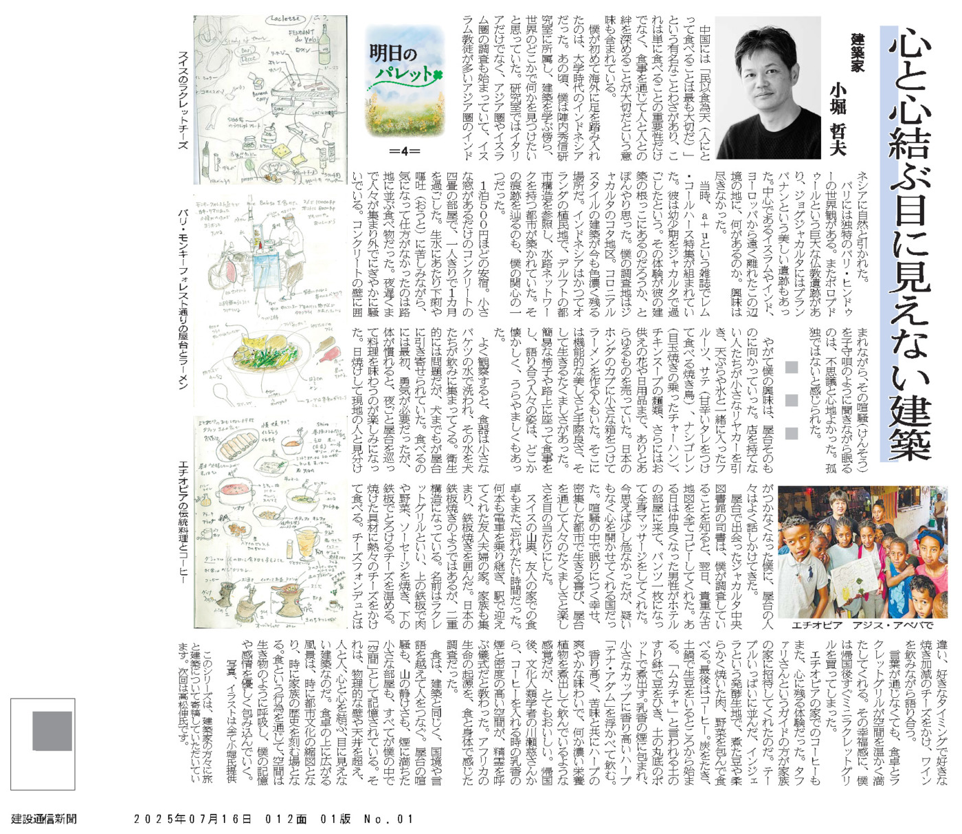 On Wednesday, July 16th, 2025, Kobori contributed an essay to a series of articles by various architects on the theme of “travel and architecture” in the Nikkan Kensetsu Tsushin Shimbun.